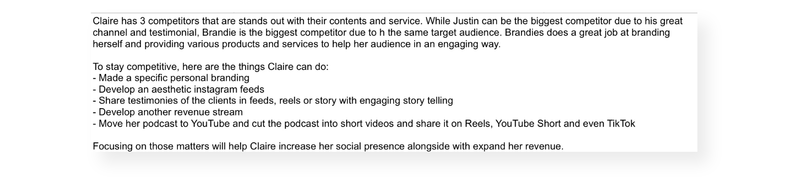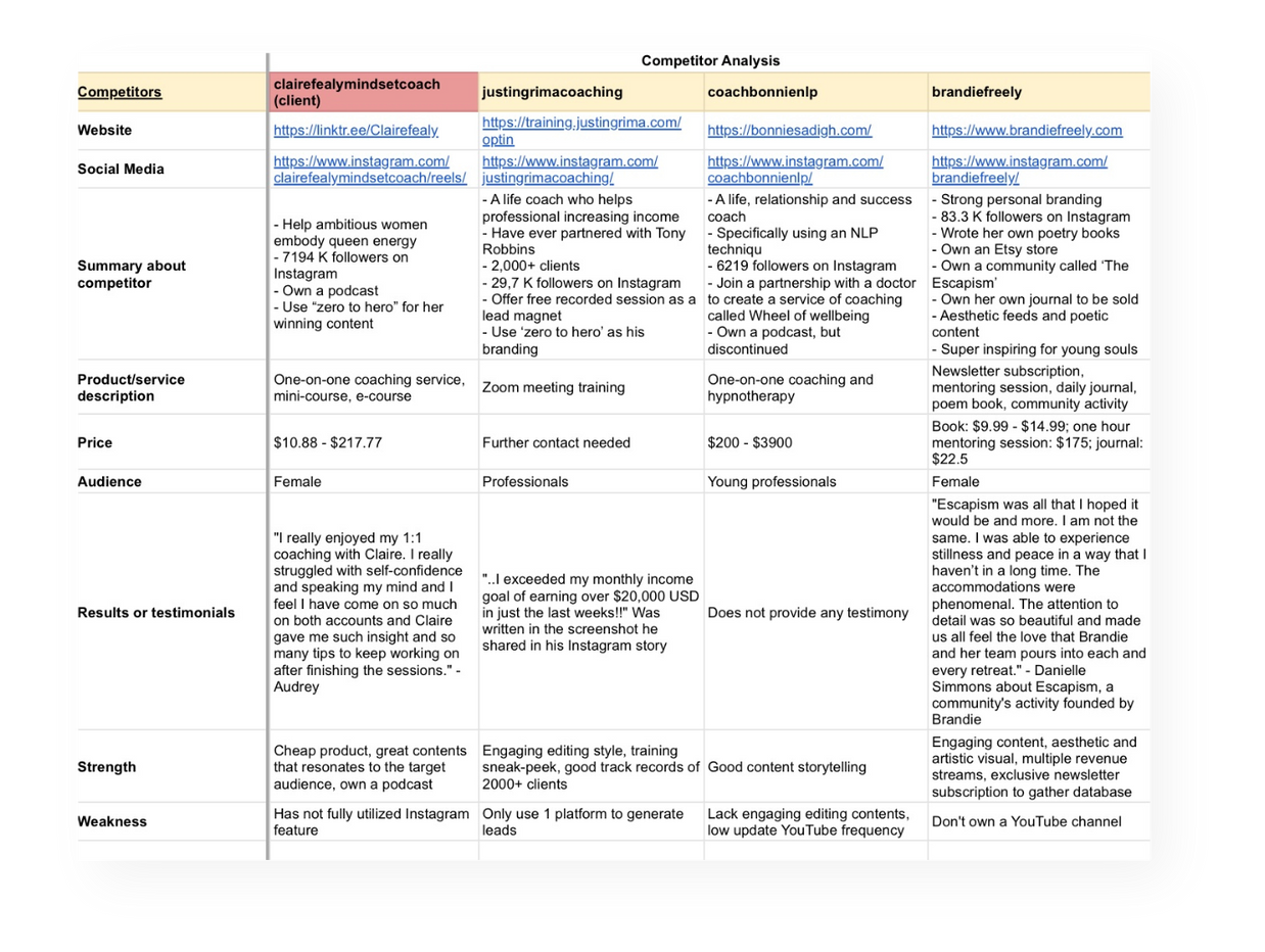 This is a dummy project for Clairefealy, who is my potential client. I identified her three competitors and gathered some valuable data to be analyzed.